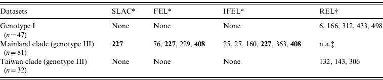 Site-specific selection pressure analysis (Table 3) was also performed by using the Datamonkey web server. The number of codons that exhibited patterns of positive selection was five (aa 6, 166, 312, 433, 498) and three (aa 132, 143, 306) for the genotype I dataset and the Taiwan clade datasets, respectively, using one detection method (REL). However, in mainland clade, two codons (aa 227, 408) were identified as being under strong positive selection using two detection methods (FEL, IFEL), and one codon (site 227) was identified using three detection methods (SLAC, FEL, IFEL).