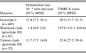 As shown in Table 4, our MCMC analysis revealed that rates of nucleotide substitution in the Taiwan clade and genotype I were 8·4 times and 8·9 times higher, respectively, than those in the mainland clade.
