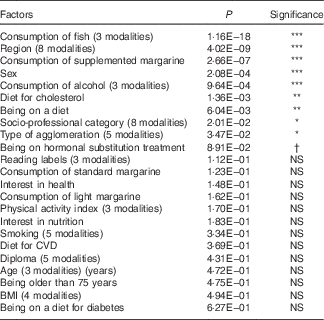 Regarding the direction of effects, we observed that the higher the fish consumption is, the higher the score is; the south of France had higher scores, as consuming margarines supplemented with n-3 FA (essentially ALA) increased the score as well as being a woman. Higher alcohol intakes were associated with lower scores (high consumption: 1·37 (sd 0·03); moderate consumption: 1·46 (sd 0·02); no consumption: 1·48 (sd 0·03); P=9·64e−4). Being on a hypocholesterolaemic diet led to higher scores (1·88 (sd 0·09) v. 1·42 (sd 0·01); P=1·36e−3); conversely, scores of people following a diet for diabetes (1·59 (sd 0·08) v. 1·44 (sd 0·01); NS) or CVD (1·69 (sd 0·15) v. 1·43 (sd 0·01); NS) were similar to controls.