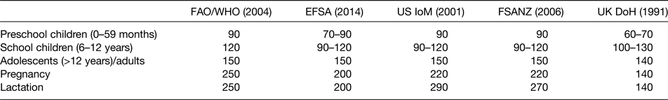 The WHO/UNICEF/International Council for the Control of IDD recommended the daily intake for adults is 150 µg/d, increasing to 250 µg/d for pregnant women(3). The European Food Safety Authority proposed in 2014 a new reference value of adequate intake for pregnant women of 200 µg/d(67). The US Institute of Medicine and the Food Standards Australia New Zealand also propose an increase in iodine intake for pregnancy and lactation. However, in the UK, the Department of Health reference nutrient intake is for adults 140 µg/d, with no proposed increment for pregnancy and lactation (Table 2)(68). Iodine requirements vary with age (Table 2), with no sex differentiations in the recommendation, besides from pregnancy and lactation. However, it is now recognised that iodine intake in preconception is important and may impact on neonatal outcomes(Reference Abel, Ystrom and Caspersen69).