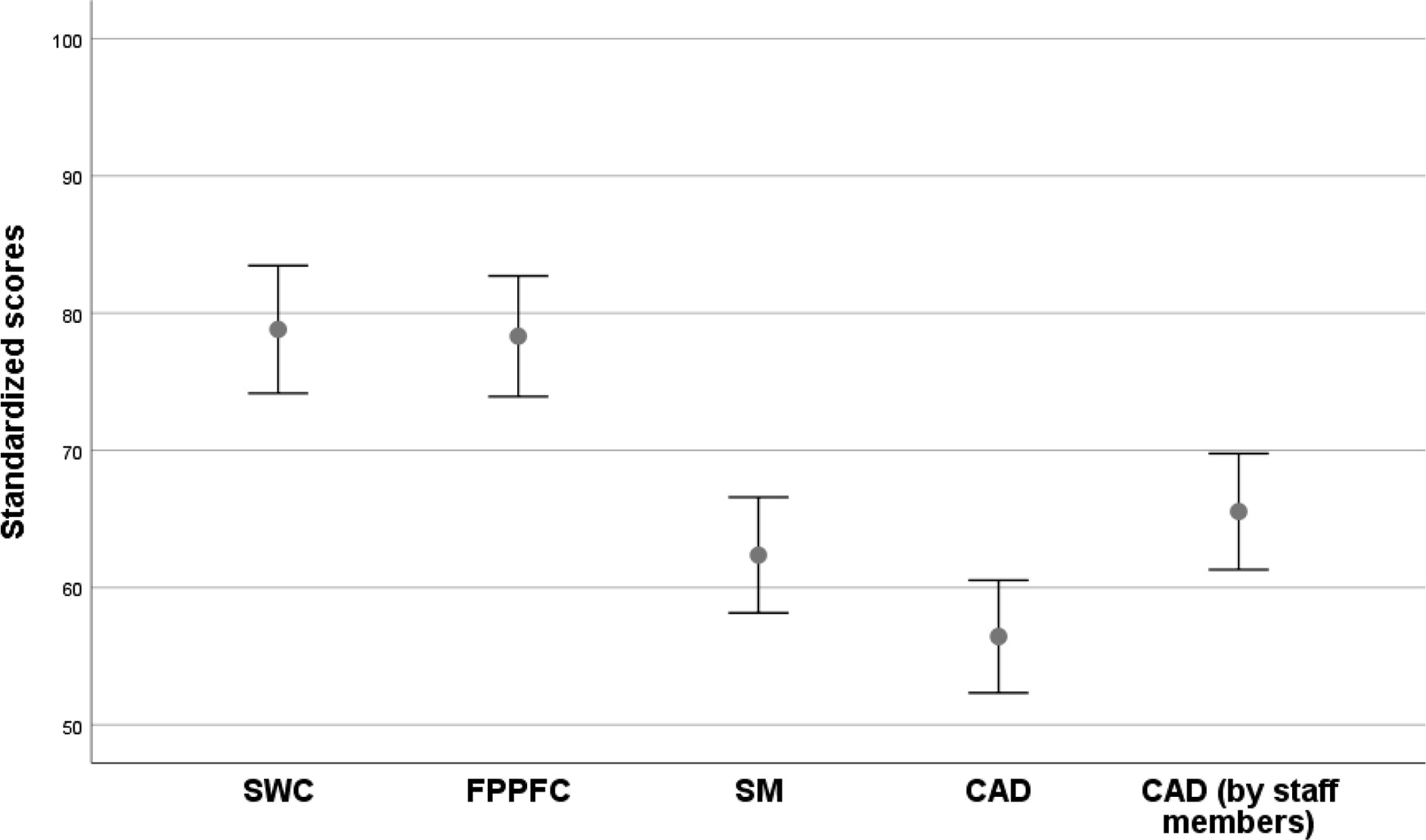 Figure 1. Box plots (mean ± 1.96 SEM) for each of the four assessment tools, with scores converted to a common scale from 0 (worst outcome) to 100 (best outcome). The four assessment tools were completed by relatives, with the CAD also completed by staff members. SWC = Satisfaction with Care; FPPFC = Family Perceptions of Physician-Family Caregiver Communication; SM = Symptom Management; CAD = Comfort Assessment in Dying