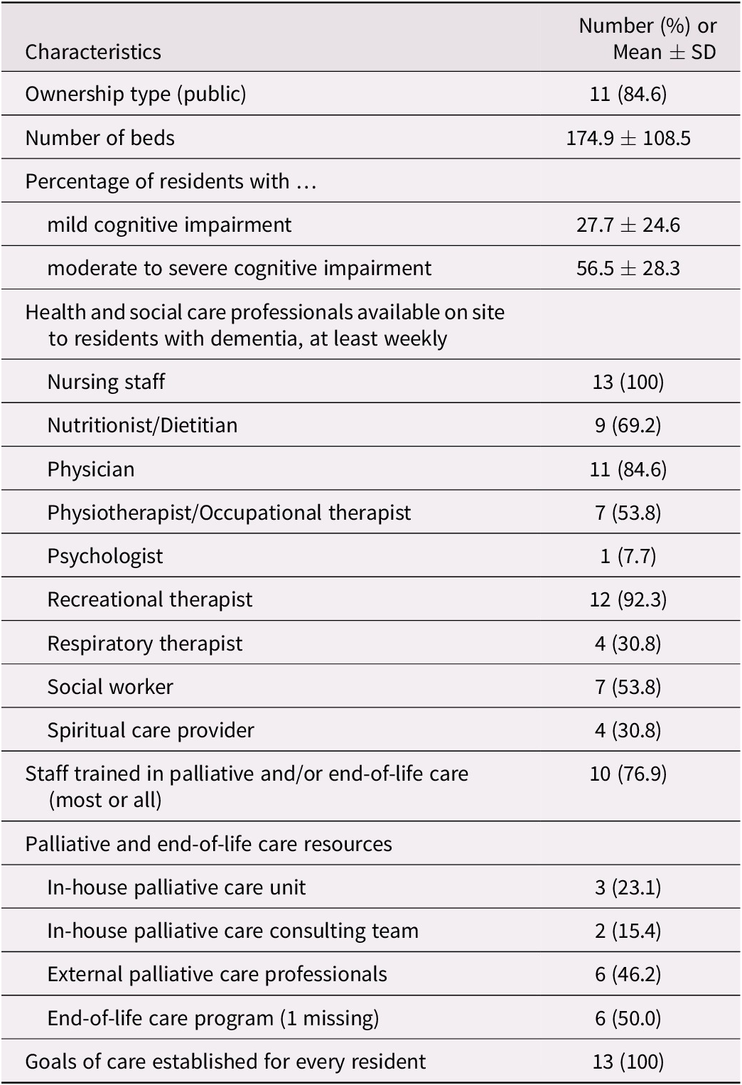 Table 1. Characteristics of the 13 participating LTC facilities