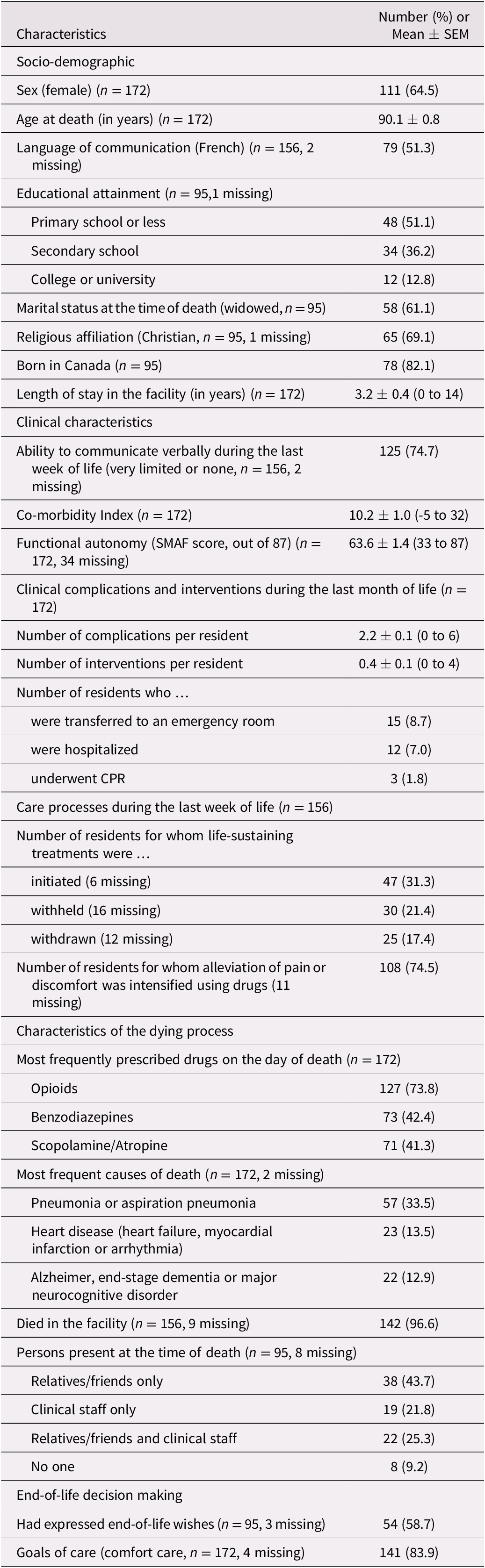 By the end of the data collection period, seven sites had reached the agreed-upon target of 10 deceased residents, and four had enrolled between 3 and 9 participants. Two larger facilities offered to surpass the target and enrolled 24 and 50 participants each, for a total of 172 deceased residents. Their characteristics are displayed in Table 2. Almost two thirds were female, with age at death ranging from 60 to 105 years. On average, the residents had spent 3 years in the facility before their death, with some having been admitted more than 10 years earlier. Most had limited ability to communicate near death and had high levels of co-morbidity, with hypertension, cardiac arrhythmias, and renal failure being among the most prevalent co-morbid conditions. Residents were highly dependent on others for their daily activities, according to their SMAF total score which, on average, had been established 6 months before death.