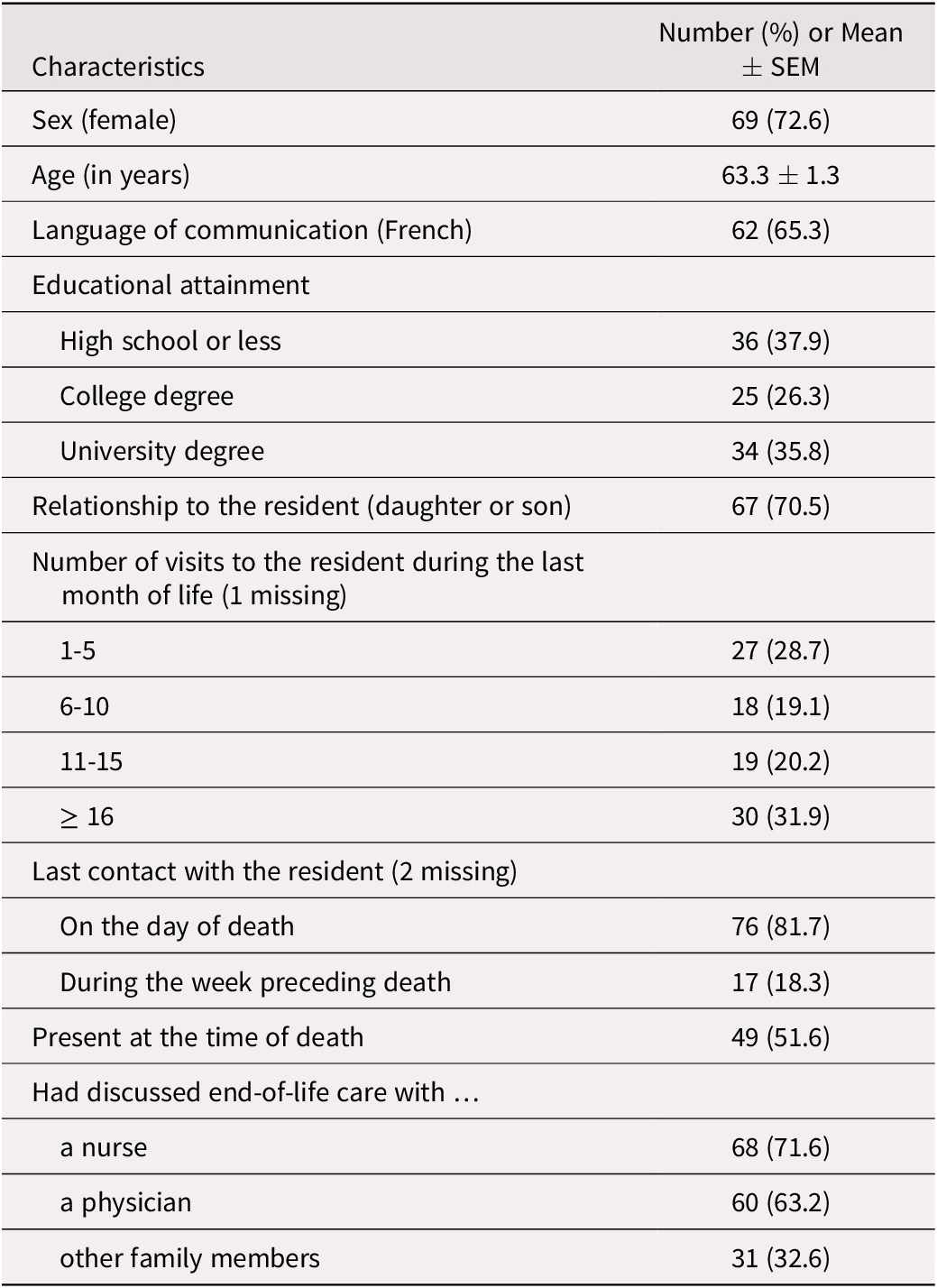 No data were collected on designated staff members, and only socio-demographic data were collected on designated relatives. Although this was justified by the need to keep questionnaires as short as possible, staff members and relatives have needs of their own worth studying. Future studies conducted within the Observatory could investigate, for example, staff working conditions and needs for emotional support (Vandrevala et al., Reference Vandrevala, Samsi, Rose, Adenrele, Barnes and Manthorpe2017). Bereaved relatives’ ability to cope with the loss of a loved one would also be worth exploring. Additionally, attention could be given to the spiritual needs of residents and families and the quality of spiritual care, two important but under-studied areas (Palmer, Smith, Paasche-Orlow, & Fitchett, Reference Palmer, Smith, Paasche-Orlow and Fitchett2020).