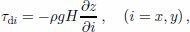 where p is ice density, g is gravitational acceleration, H is ice depth and z is surface elevation. The resistive stresses are written in terms of deviatoric stresses as follows (neglecting vertical resistive stresses):