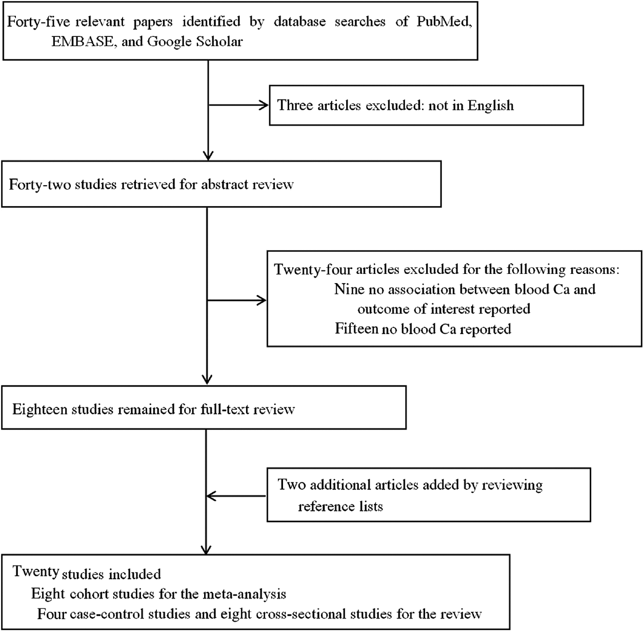 The literature selection process is shown in Fig. 1. A total of forty-five related articles were retrieved from PubMed, Embase and Google Scholar. Of these, three articles were excluded since they were not issued in English; nine publications were further excluded because they did not associate blood Ca with an outcome of interest and additional fifteen articles were excluded because they did not report blood Ca as either a categorical variable or a continuous variable on the original scale. Furthermore, we also identified two articles by searching the reference lists of relevant publications. Thus, the search revealed eight cohort studies( Reference Jorde, Schirmer and Njølstad 3 , Reference Becerra-Tomás, Estruch and Bulló 4 , Reference Rooney, Pankow and Sibley 6 , Reference Sing, Cheng and Ho 9 , Reference Zaccardi, Webb and Carter 10 , Reference Lorenzo, Hanley and Rewers 17 , Reference Kim, Oh and Hong 22 , Reference Suh, Bae and Jin 27 ) for the meta-analysis and another twelve eligible studies (four case–control studies( Reference Sorva and Tilvis 7 , Reference Levy, Stern and Gutman 18 , Reference Heath, Lambert and Service 34 , Reference McNair, Fogh-Andersen and Madsbad 35 ) and eight cross-sectional studies( Reference Kim, Kim and Jang 19 – Reference Sun, Vasdev and Martin 21 , Reference Wareham, Byrne and Carr 23 , Reference Hagström, Hellman and Lundgren 24 , Reference Cho, Shin and Yi 36 – Reference Guasch, Bulló and Rabassa 38 )) for the systematic review.