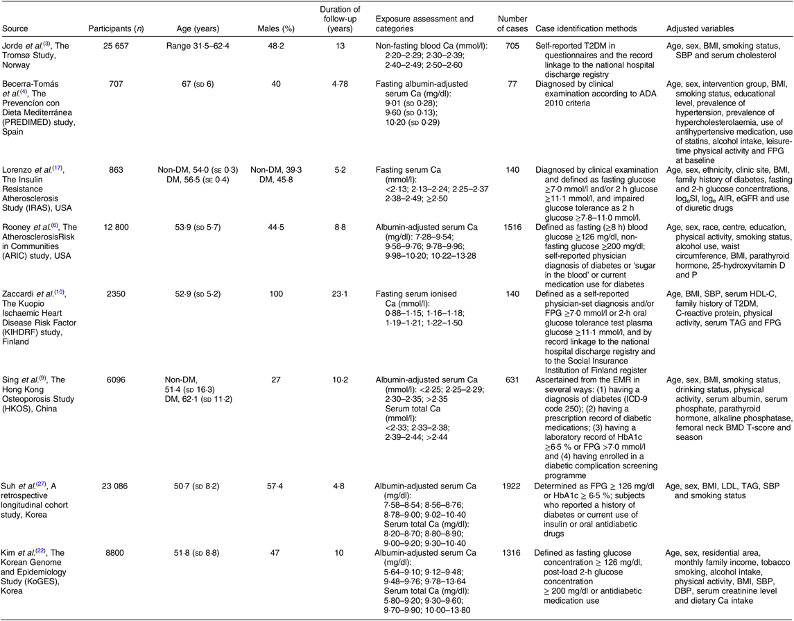 Studies were considered for inclusion if they met the following criteria: (a) published in English; (b) had a cohort, case–control or cross-sectional design; (c) provided the exposure information of total serum Ca, albumin-adjusted serum Ca or serum ionised Ca and (d) had a relative risk (RR), hazard ratio (HR) or OR with 95 % CI for T2DM in relation to Ca exposure or a correlation coefficient between Ca exposure and T2DM related variables (e.g. fasting glucose, fasting insulin, insulin sensitivity and insulin resistance), or such information could be derived from the published results.