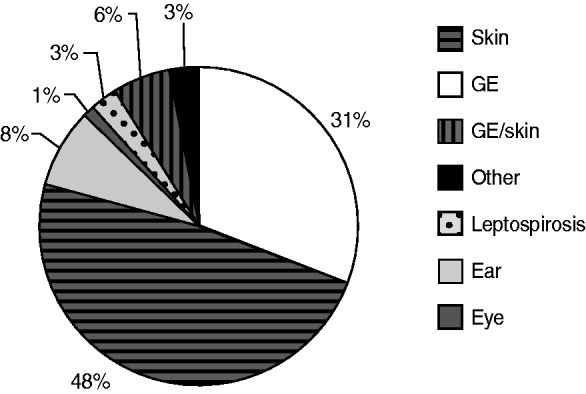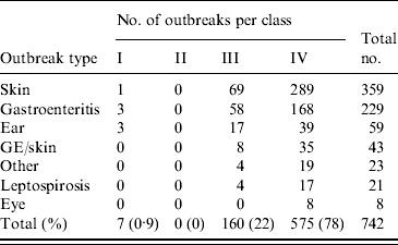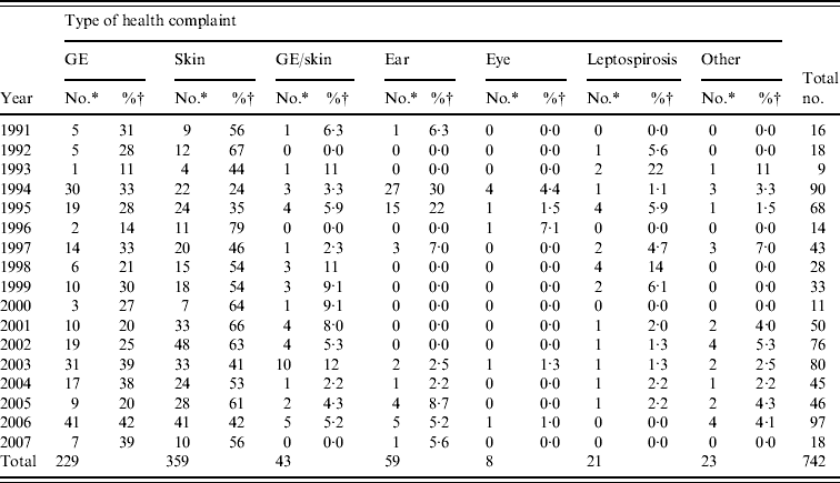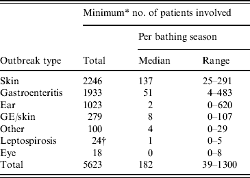 For 155/742 (21%) outbreaks the number of patients involved was not reported in absolute numbers: ‘several’, ‘more than one’ and ‘tens’ were common indications. In assessing the total number of patients involved, for those outbreaks the number of patients was set at two, although there could have been (many) more. As a result of this approach, the total estimated number of patients involved in the 742 outbreaks was at least 5623. Most patients suffered from skin (40%) or gastrointestinal (34%) conditions, followed by ear conditions (18%). Patients that had gastroenteritis and skin complaints (5%), eye conditions (0·3%), leptospirosis (0·4%) or other health complaints (2%) comprised only fractions of the total number of patients (Table 7).