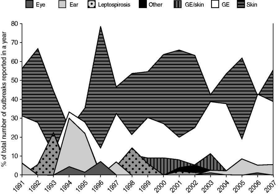 Recreational waterborne disease outbreaks were defined as water exposures in which two or more persons were epidemiologically linked to untreated recreational water by location of exposure, time and illness [Reference Yoder9]. Single cases of leptospirosis and wound infections were included in the outbreak counts; such infections affect individuals rather than groups of people.