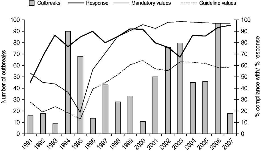 Fig. 3. The number of waterborne disease outbreaks associated with untreated recreational water reported in The Netherlands from 1991 to 2007, the percentage of authorities that responded to the request for information about such outbreaks, and compliance with mandatory and guideline values for faecal indicator bacteria in European bathing-water legislation [11, 12].