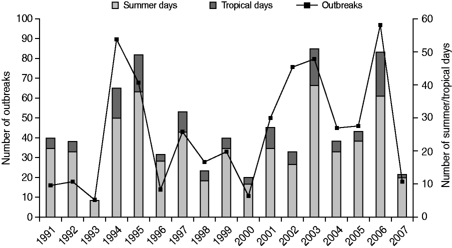 Fig. 4. The number of waterborne disease outbreaks associated with untreated recreational water reported in The Netherlands from 1991 to 2007 in relation to the number of summer days (i.e. days with a maximum temperature of ⩾25°C; www.knmi.nl) and tropical days (i.e. days with a maximum temperature of ⩾30°C; www.knmi.nl) in a summer.