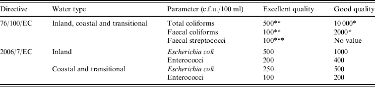 Table 1. Faecal indicator parameters and compliance criteria for untreated recreational water according to European Bathing Water Directives 76/100/EC [11] and 2006/7/EC [12]