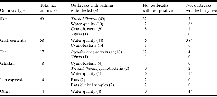 Only two of the reported outbreaks occurred outside the official bathing season (one in October 2002, one in April 2005) and these were included.