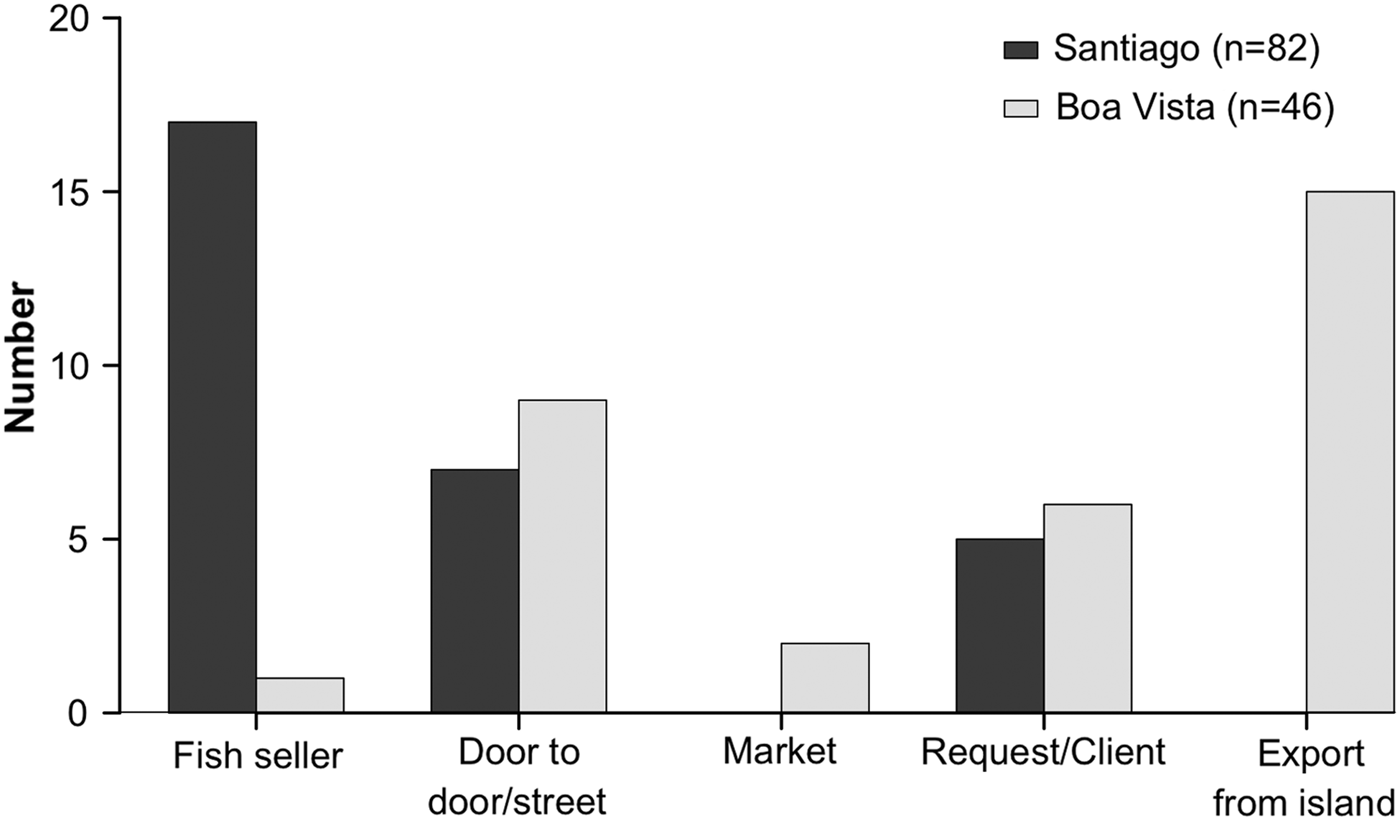 The information gathered from the interviews suggests that the typical trade chain varied between islands. On Santiago the majority of the fishers that actively harvested marine turtles chose to have fish sellers as intermediaries between them and the consumers (n = 18), thus creating a trade, although some stated that they had a well-established list of regular customers (n = 5). In Boa Vista only one of the five known fish sellers was actively involved in the sale of turtle meat (Fig. 3).