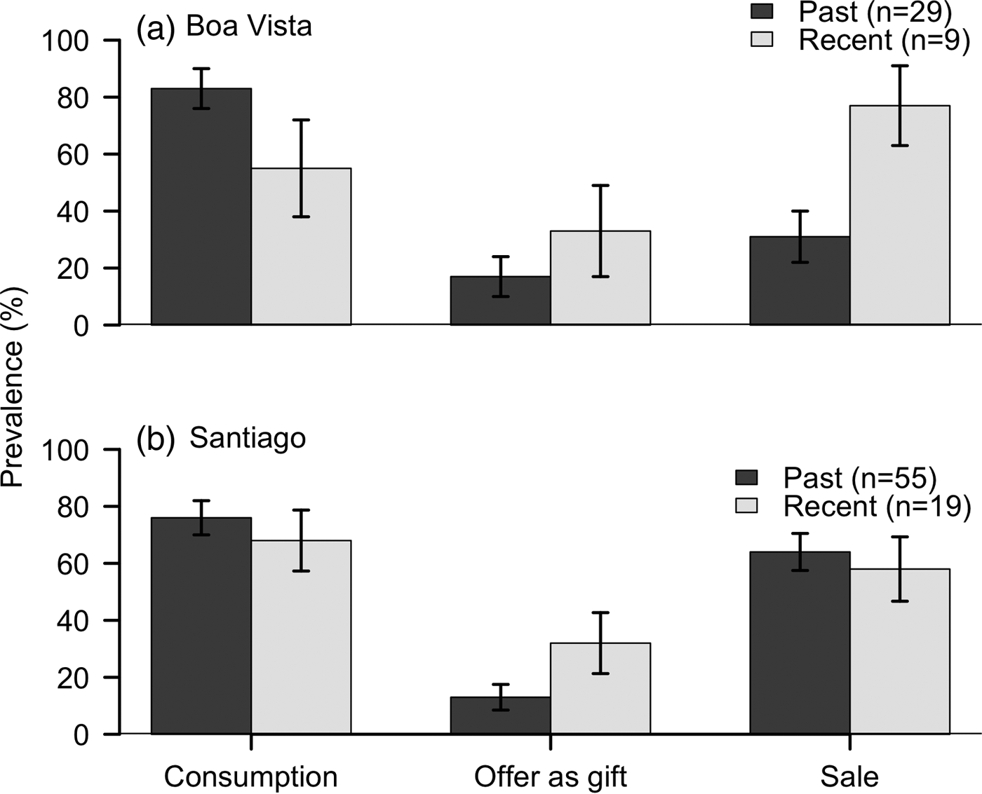Fig. 5 Past and recent uses of marine turtles by fishers on (a) Boa Vista and (b) Santiago (Fig. 1), suggesting a shift to commercial use on Boa Vista.