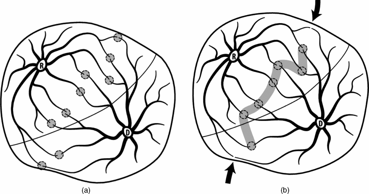 FIGURE 1 (a). Selective photocoagulation of communicating vessels (SLPCV). All of the anastomoses are photocoagulated, regardless of their location relative to the dividing membrane, while sparing non-anastomotic vessels. Rate of residual patent placental vascular anastomoses: 3.5–5%. (Chmait et al., Reference Chmait, Assaf and Benirschke2010; Kontopoulos et al., Reference Kontopoulos, Chmait, Baker, Llanes and Quintero2015). (b) Solomon modification of the SLPCV technique. The fetal surface of the placenta between endoscopically identified anastomoses is also lasered, to occlude ‘anastomoses’ not visible by the endoscope. Note that marginal anastomoses may be missed, as they are not between laser shots. Rate of residual patent vascular anastomoses: 20% (Slaghekke, Lopriore et al., Reference Slaghekke, Lopriore, Lewi, Middeldorp, van Zwet, Weingertner and Oepkes2014).