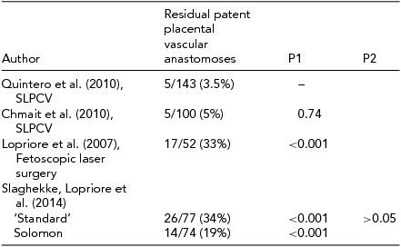 TABLE 1 Reported Incidence of Residual Patent Placental Vascular Anastomoses After Laser Surgery on Surgical Pathology Analysis of the Placentas. Comparisons Made Relative to the Lowest Reported Rate (P1) or Between the ‘Standard’ and the Solomon Techniques (P2)