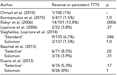 As other centers began to adopt the selective technique, one particular issue of concern became apparent. Indeed, the reported incidence of residual patent placental vascular anastomoses after laser surgery on surgical pathology analysis of the placentas varied significantly between centers (Table 1). Similarly, the incidence of failed surgery, defined as PRTTTS, which is the clinical manifestation of residual patent placental vascular anastomoses after laser surgery, also varied significantly (Table 2). In a study by Robyr et al. (Reference Robyr, Lewi, Salomon, Yamamoto, Bernard, Deprest and Ville2006), the rate of failed surgery was 22%. Anemia after demise of one of the fetuses was also noted as a complication, which is indirect evidence of residual patent placental vascular anastomoses as well. Lopriore et al. (Reference Lopriore, Middeldorp, Oepkes, Klumper, Walther and Vandenbussche2006) reported an incidence of 33% of residual patent placental vascular anastomoses in 52 TTTS patients treated with laser at their institution. In comparison, the rate of residual patent placental vascular anastomoses after SLPCV by our group, using similar technique and technology, has consistently been less than 5%, with no anemia after demise of the co-twin, and an incidence of reverse or persistent TTTS of only 1–1.5% (USFetus Consortium; Quintero, Reference Quintero and Quintero2007).