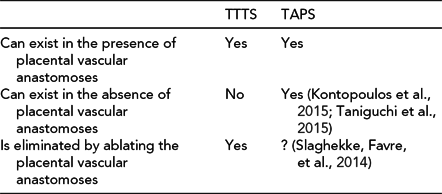 3. contrary to TTTS, ablation of residual patent placental anastomoses in cases of TAPS does not necessarily eliminate the condition. Table 5 compares TTTS with TAPS relative to the role of placental vascular anastomoses.