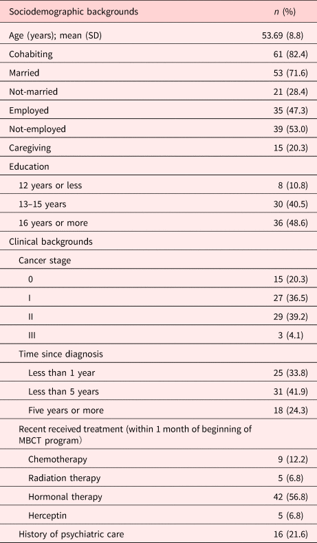 This study is a secondary analysis of a randomized controlled trial (RCT) of MBCT for breast cancer patients. The details of the original study are described elsewhere (Park et al., Reference Park, Sato and Takita2020). In short, 74 patients were randomized in 1:1 ratio to either eight-week MBCT or the wait-list control. The participants’ eligibility for the RCT was the following: (1) clinical diagnosis of Stage 0–III breast cancer, (2) aged between 20–74, (3) the Hospital Anxiety and Depression Scale (HADS) total score of five or over at recruitment, (4) the Eastern Cooperative Oncology Group performance status (ECOG) performance status of 0–2, (5) estimated prognosis of survival of 1 year or over, (6) ability to communicate in Japanese, and (7) submission of written informed consent. Exclusion criteria were the patients with (1) past experience of MBCT or MBSR, and (2) severe physical, psychiatric, or cognitive symptoms that hamper program participation. The study procedures complied with the institutional review board of Keio University School of Medicine, the Declaration of Helsinki, and the Ethics Guideline for Clinical Studies of 2009 implemented by the Japan Ministry of Health, Labour and Welfare of Japan. The study was registered in the Japanese Clinical Trial Registry (registry ID: UMIN-CTR 000016142). The results of the original study were that the MBCT group experienced significantly greater improvement at the eighth week in their psychological distress, compared with the control group (the mean difference in the HADS total score of 7.82, with 95% CI of 11.28–6.35; p < 0.001), with an effect size of Cohen's d = 1.17. The difference remained significant at 12 weeks.