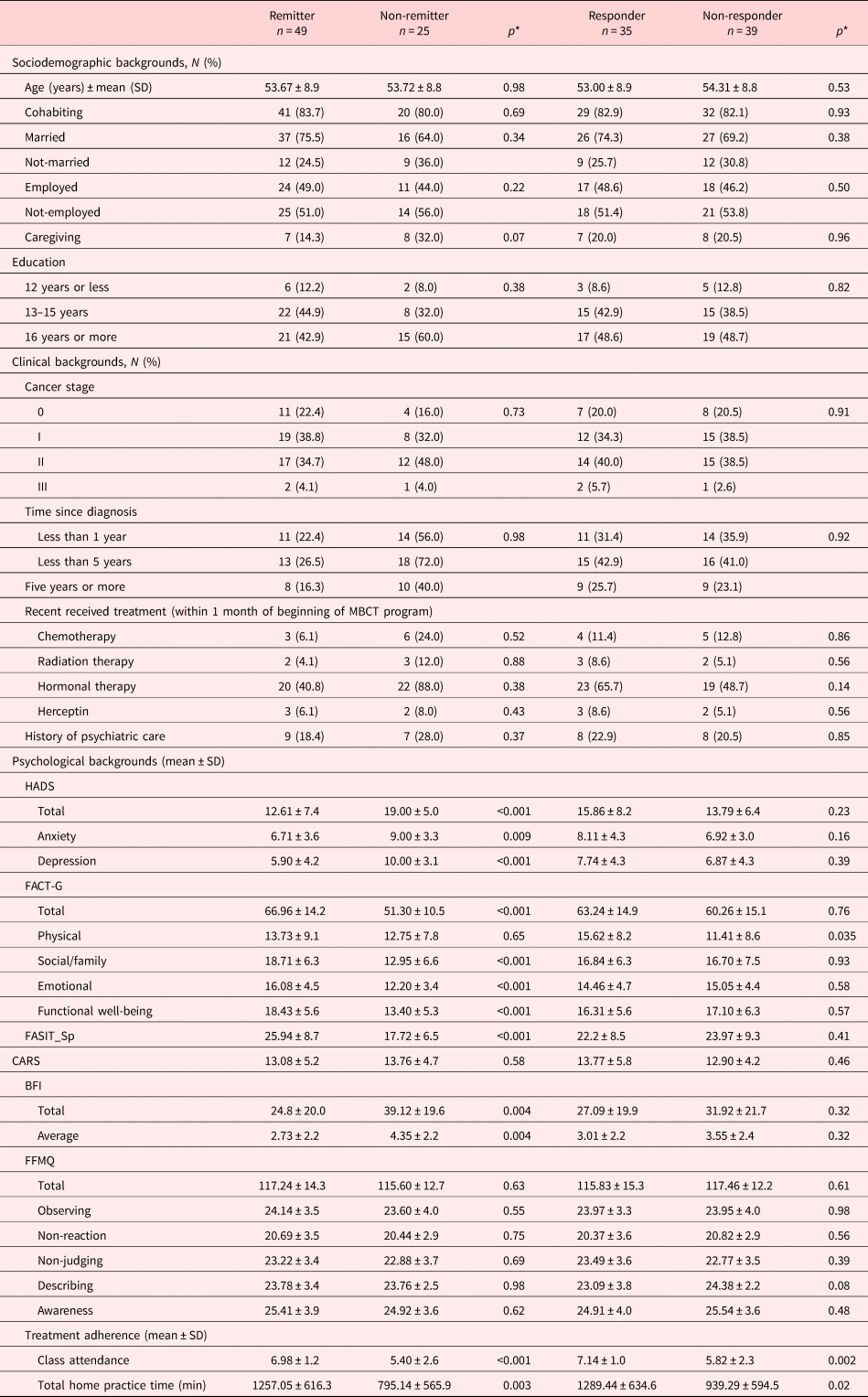 To examine the factors associated with treatment response and remission, we conducted bivariate analysis using the chi-square test for categorical variables, t-tests for normally distributed continuous variables, and the Wilcoxon rank sum tests for continuous variables with skewed distribution. Then, we entered the following variables into logistic regression analysis: age, history of education, time since diagnosis, QOL, HADS total score at baseline, and treatment adherence. These variables were selected based on the past studies that demonstrated their possible association with treatment response (Johannsen et al., Reference Johannsen, O'Toole and O'Connor2017; Parsons et al., Reference Parsons, Crane and Parsons2017; Tovote et al., Reference Tovote, Schroevers and Snippe2017), and based on our hypotheses that patients who are at medically stable conditions (with longer time since diagnosis and better QOL) are more likely to benefit from MBIs. Considering high collinearity (r=0.691, p<0.001), we chose the number of class attendance instead of minutes spent for homework for logistic regression analysis to represent treatment adherence.