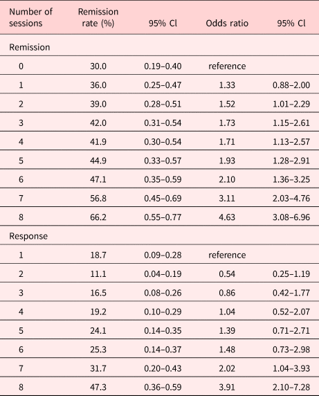 Proportions of patients who reached remission and response at each session are shown in Table 5. More than 50% of patients remitted at the seventh session. The significant difference in the treatment response was observed at the seventh session.