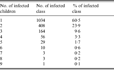 Table 4. Frequency of the number of infected children in 1708 infected classes with Enterobius vermicularis infection from 4907 classes in 385 primary schools of Taiwan