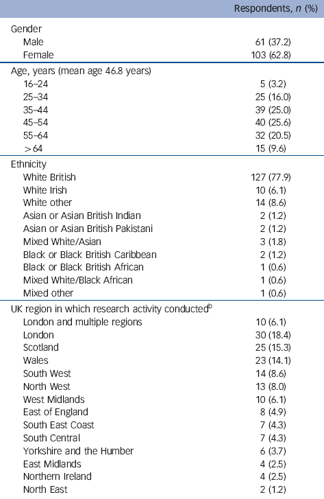 The sample was predominately female (n = 103, 62.8%) and White British (n = 127, 77.9%). Respondents ranged in age from 21 to 73 years (median 47). With few (n = 22, 13.3%) reporting no formal educational or vocational qualifications, respondents were characteristically tertiary educated and highly trained. Nearly two-thirds (n = 106, 63.9%) reported under- (n = 44) or postgraduate (n = 62) degrees in diverse fields including health, humanities, fine arts, engineering and teaching. Seventeen (10.2%) held research degrees (PhD, MD) and 48 (28.9%) reported qualifications in healthcare fields including medicine, social work, nursing and psychology. Professional and other training reported by respondents was extensive, encompassing counselling, community education and project management. Research-focused training - for example in interviewing skills, software packages, analytic methods, particular study instruments and good clinical practice - was commonly reported. Several respondents reported completing training run by the MHRN or NHS trusts.
