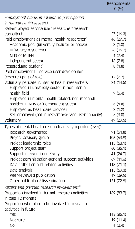 Table 3 Employment status in relation to mental health research and research activity (n = 166)Footnote a