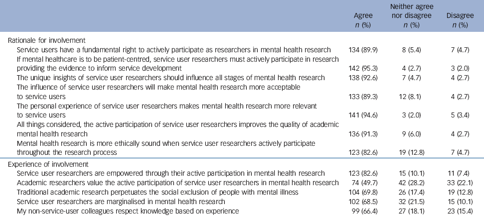 The vast majority of respondents (n = 136/149, 91.3%) agreed that ‘all things considered, the active participation of service user researchers improves the quality of mental health research’.