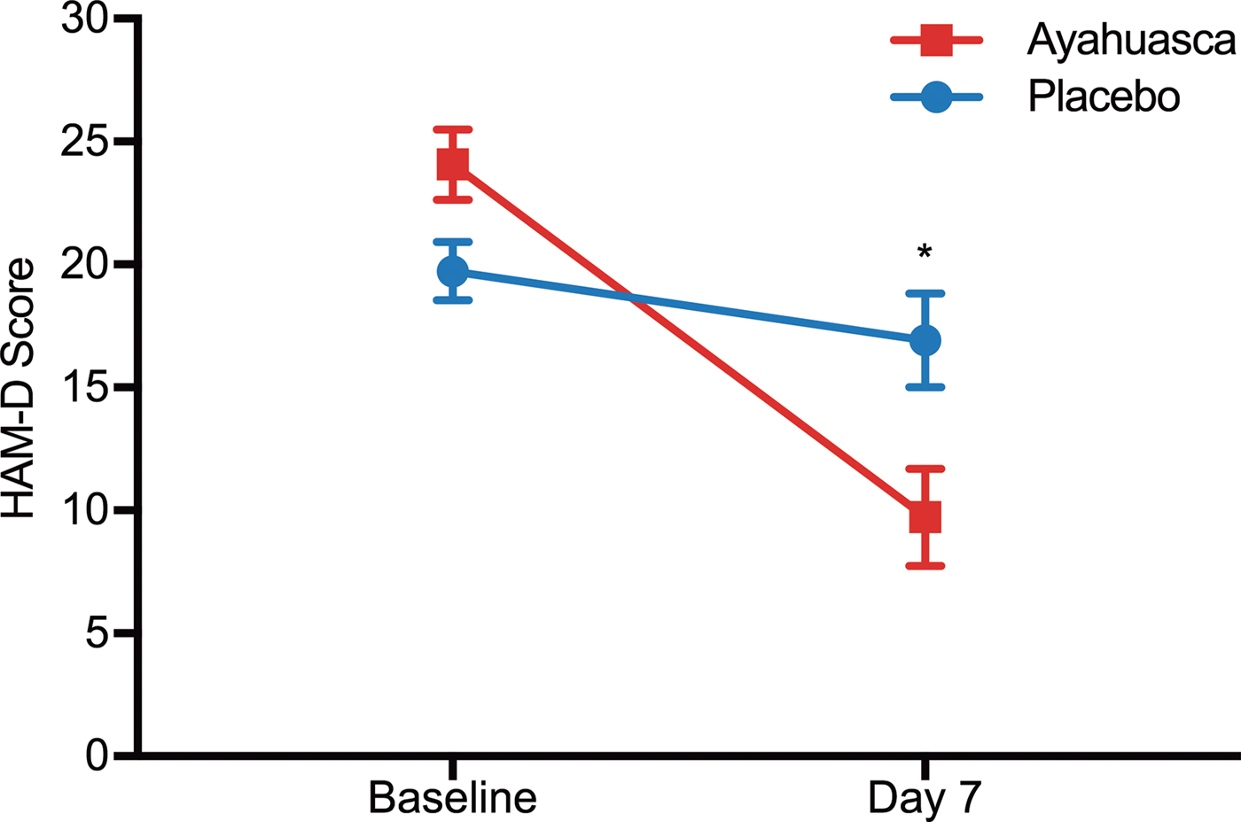 Fig. 2. HAM-D scores at baseline and seven days after dosing. Statistical analysis shows a significant difference between ayahuasca (squares) and placebo (circles) seven days after dosing (p = 0.019). Between-group effect size is high (Cohen's d = 0.98). Values are (mean ± s.e.m.). HAM-D scores: mild depression (8–16), moderate (17–23), severe (⩾24).
