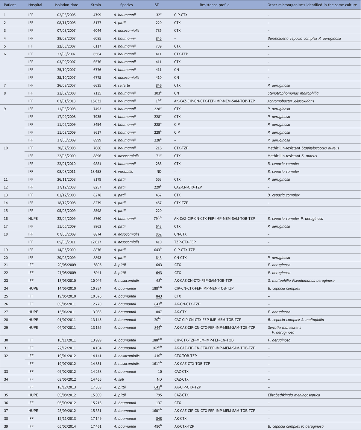Table 2. Acinetobacter baumannii complex STs shared by different patients with CF
