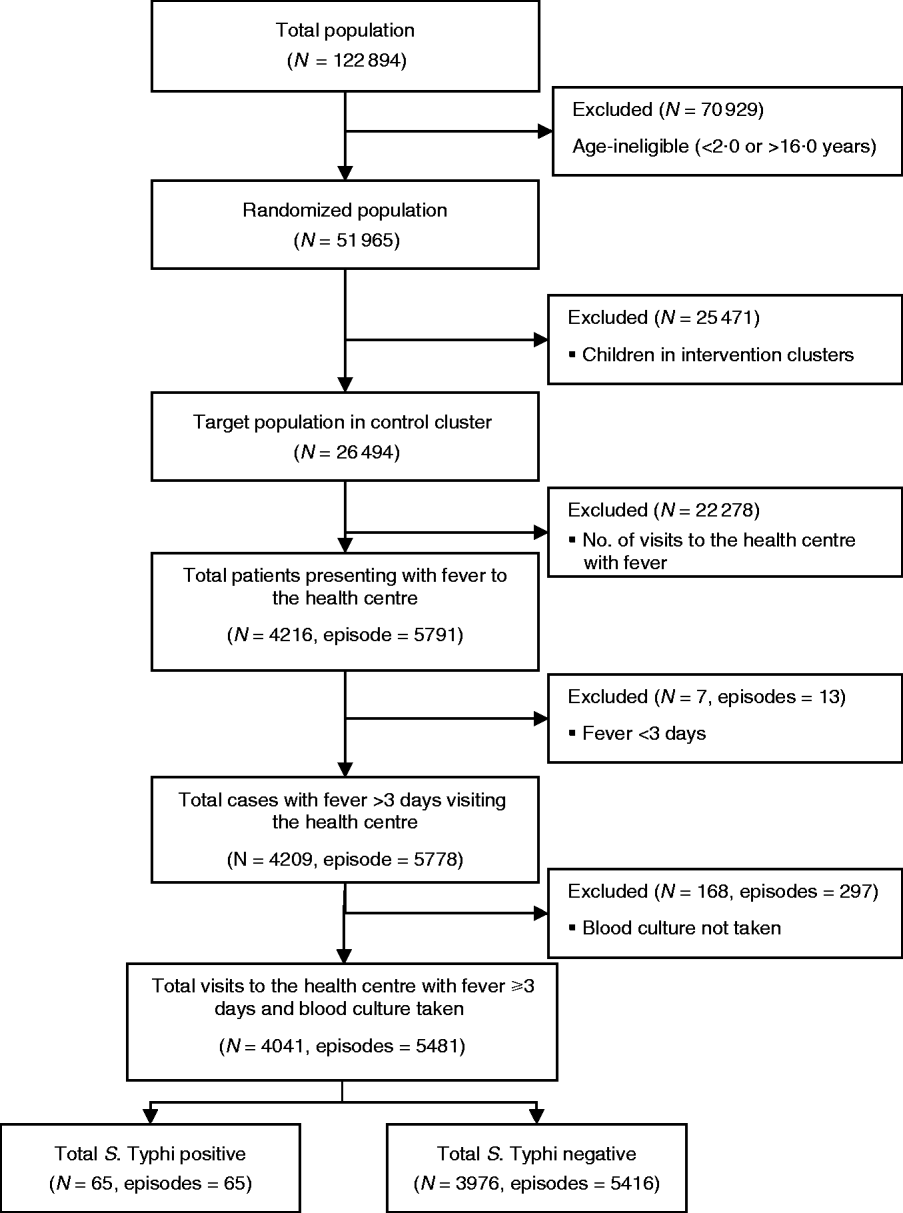 A typhoid fever case was an eligible child who (i) visited the project health clinics with a history of fever for ⩾3 days, (ii) registered and had venous blood taken for microbiological confirmation, (iii) had S. Typhi isolated and his/her identity confirmed through a home visit. Enrolment in the surveillance was irrespective of the randomization clusters. The assessment of factors that determined the outcome of typhoid fever was based on individual, household and geographical clusters. These included basic demographic variables such as age, sex, household income, number of individuals living in the house, population density and distance to the health centre. Exclusion criteria were: children who enrolled in the study but did not have a blood sample taken, or the blood culture results were missing, or residential confirmation was not possible on a follow-up visit. Typhoid cases were compared with culture-negative fever episodes for the evaluation of risk factors for typhoid fever in children who were residing in the hepatitis A group clusters.