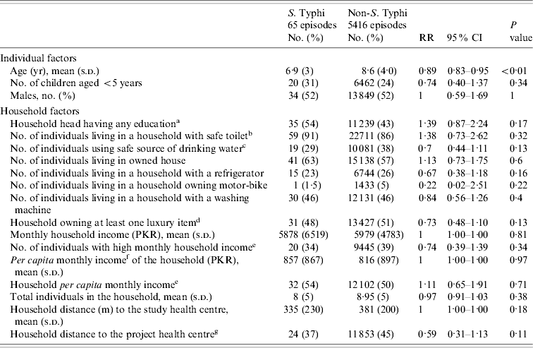 We performed log-binomial regression analysis for assessment of risk factors for typhoid fever in children. The independent relationships of individual, household and cluster factors were evaluated for statistical significance. Age [risk ratio (RR) 0·89, 95% confidence interval (CI) 0·83–0·95], population density (RR 1·13, 95% CI 1·05–1·22) and residing in Sultanabad compared to Bilal colony (RR 3·18, 95% CI 1·55–6·5) had a statistically significant independent relationship with typhoid fever. In univariate analysis we did not find a statistically significant association of socioeconomic factors with typhoid fever. We adjusted for effect of covariates and cluster correlation in the final model. After adjustment, the risk of typhoid decreased with increasing age (RR 0·89, 95% CI 0·83–0·95), was higher with an increase in population density (RR 1·13, 95% CI 1·05–1·22) and was lower in the households using a safe drinking-water source (RR 0·63, 95% CI 0·41–0·99) (Table 3).