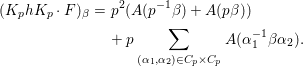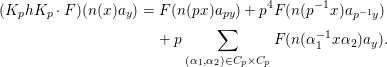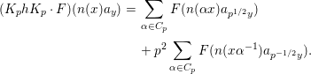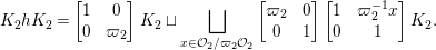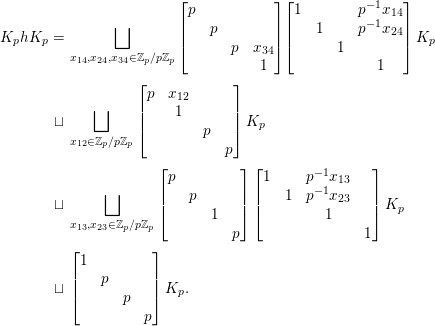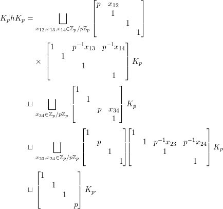 $$\begin{eqnarray}K_{2}\left(\begin{array}{@{}cc@{}}{\it\varpi}_{2}^{n} & 0\\ 0 & 1\end{array}\right)K_{2}=\underset{x\in {\mathcal{O}}_{2}/{\it\varpi}_{2}^{n}{\mathcal{O}}_{2}}{\sqcup }\left(\begin{array}{@{}cc@{}}\mathop{{\it\varpi}}_{2}^{n} & 0\\ 0 & 1\end{array}\right)\left(\begin{array}{@{}cc@{}}1 & \mathop{{\it\varpi}}_{2}^{-n}x\\ 0 & 1\end{array}\right)K_{p}\sqcup \left(\begin{array}{@{}cc@{}}1 & 0\\ 0 & {\it\varpi}_{2}^{n}\end{array}\right)K_{p}.\end{eqnarray}$$ It is verified that the Hecke operator defined by