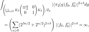 $$\begin{eqnarray}\displaystyle & & \displaystyle \displaystyle \int _{\left(\mathop{\sqcup }_{n\geqslant 0}K_{2}\left(\begin{array}{@{}cc@{}}{\it\varpi}_{2}^{n} & 0\\ 0 & 1\end{array}\right)K_{2}\right)/Z_{p}}|\langle {\it\pi}_{2}(g)f_{0},f_{0}^{\prime }\rangle |^{2+{\it\delta}}dg\nonumber\\ \displaystyle & & \displaystyle \quad =\left(\displaystyle \mathop{\sum }_{n\geqslant 0}(2^{3n/2}+2^{n/2})^{2+{\it\delta}}\right)|\langle f_{0},f_{0}^{\prime }\rangle |^{2+{\it\delta}}=\infty ,\nonumber\end{eqnarray}$$ which leads to a contradiction. We therefore see that