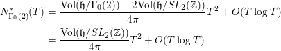 $$\begin{eqnarray}\displaystyle N_{{\rm\Gamma}_{0}(2)}^{\ast }(T) & = & \displaystyle \displaystyle \frac{\text{Vol}(\mathfrak{h}/{\rm\Gamma}_{0}(2))-2\text{Vol}(\mathfrak{h}/SL_{2}(\mathbb{Z}))}{4{\it\pi}}T^{2}+O(T\log T)\nonumber\\ \displaystyle & = & \displaystyle \displaystyle \frac{\text{Vol}(\mathfrak{h}/SL_{2}(\mathbb{Z}))}{4{\it\pi}}T^{2}+O(T\log T)\nonumber\end{eqnarray}$$