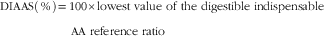 $$\eqalignno{ {\rm DIAAS}\left( {\rm \,\%\,} \right)\,&{\rm {\equals}\, 100}{\times}{\rm lowest\,\, value\,\,of\,\,the\,\,digestible}\,\, \rm indispensable \cr \,\,\,\,\rm \,\,AA\,\,reference\,\,ratio}.$$