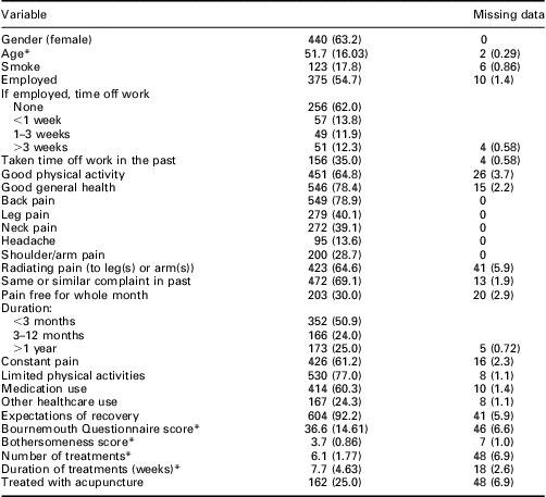 The demographic and clinical characteristics of the study sample are shown in Table 1. The mean age of the sample was 52 years, approximately two-thirds was female and just over half was in paid employment. Of these, approximately a third had taken some time off work for their complaint, and a third reported having taken time off work in the past for a similar complaint. Approximately two-thirds of the sample considered their overall levels of physical activity to be either more or about the same compared with people of a similar age, and apart from their musculoskeletal complaint the majority of patients considered themselves to be in excellent to good general health.