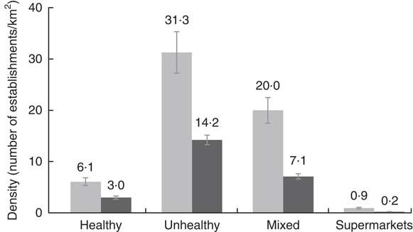 Table 2 shows that the density of healthy, unhealthy and mixed establishments was not significantly associated with the presence of obesity among children and adolescents. However, it was found that the density of supermarkets and hypermarkets had an inverse association with the presence of obesity (P<0·05).