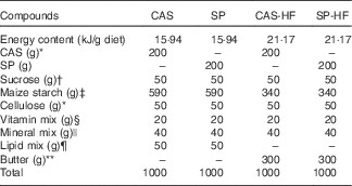 At the beginning of the experiment, rats were fed an HFD containing 20 % casein (CAS) and 30 % butter (containing 67 % SFA) for 5 weeks in order to induce insulin resistance. After this period, rats weighing 366 (sem 25) kg received a single intraperitoneal injection of low-dose STZ (35 mg/kg body weight (BW)) (Sigma) in 0·1 m-citrate buffer (pH 4·5) after an overnight fast. Diabetes was identified by measuring fasting glycaemia 48 h after STZ injection (glycaemia at d0=6·63 (sem 0·33) mm, and after 48 h STZ injection 24·36 (sem 4·66) mm). Animals with blood glucose levels above 11 mm were considered diabetic (n 24), and they were randomly divided into four groups of six rats each and fed for 28 d a diet containing 20 % CAS or purified SP, combined with 5 % of mixed oils (3·9 % olive, 1 % nut, 0·1 % sunflower, with a n-6:n-3 ratio of 7) (CAS, SP), or with 30 % lipids (CAS-HF, SP-HF). The diet composition is shown in Table 1. Food and water were provided ad libitum. Glycaemia (using a one-touch glycometer Accu-Chek Active; Accu-Chek) and BW were recorded weekly. Over a 5- d period during the 4th week, faecal and urinary samples were collected in both groups housed in metabolism cages.