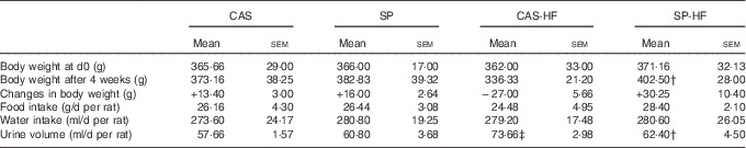 At d0, the BW of the rats was similar in all the groups, whereas, at d28, an increase by 20 % was observed in the SP-HF group compared with the CAS-HF group. In SP, CAS and SP-HF groups, a weight gain was noted, whereas a loss was shown in the CAS-HF group. There was no significant difference in food and water intake (Table 2). Urine volume was increased by 28 % in CAS-HF compared with CAS and decreased by 15 % in SP-HF compared with CAS-HF (Table 2).