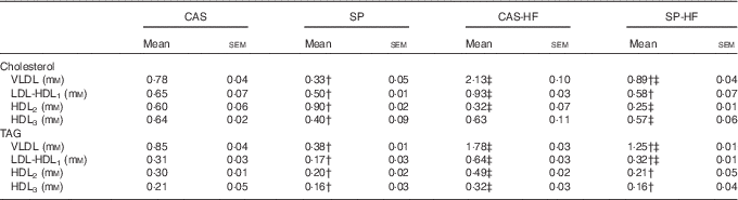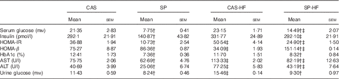 ) groups. Values are means (n 6), with their standard errors. Statistical analysis was performed using the least significant difference test. Mean values was significantly different (P<0·05). * SP v. CAS (P<0·05). † SP-HF v. SP or CAS-HF v. CAS (P<0·05).