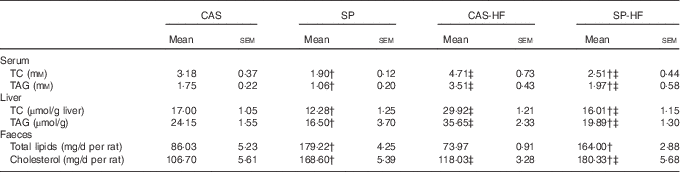 Serum TC and TAG concentrations were increased, respectively, by 48 and 101 % in CAS-HF v. CAS and by 32 and 86 % in SP-HF v. SP. Similarly, high values were noted in liver TC and TAG (76 and 48 %, respectively) in CAS-HF v. CAS and (30 and 21 %, respectively) in SP-HF v. SP (Table 4). Interestingly, these values decreased in SP compared with CAS, and in SP-HF compared with CAS-HF. Faecal total lipids were 2·08- and 2·22-fold higher, respectively, in SP than in CAS and in SP-HF than in CAS-HF. Indeed, faecal cholesterol concentrations were 1·58- and 1·53-fold higher, respectively, in the same groups.