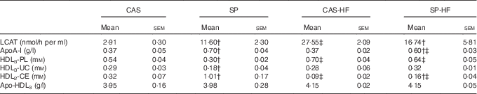 In the CAS-HF v. CAS groups, serum LCAT activity (Table 6) and its substrate HDL3-PL were 9·46- and 1·29-fold higher, respectively, whereas there was no significant difference in acyl acceptor HDL3-UC. The reaction product HDL2-cholesteryl esters (CE) was 3·55-fold lower. In the SP-HF group, HDL3-PL was 2·13-fold higher and HDL2-CE was 6·31-fold lower than in the SP group. However, in the SP group compared with the CAS group, serum LCAT activity, apoA-I and HDL2-CE were 4-, 1·97- and 3·15-fold higher, respectively, whereas HDL3-PL and HDL3-UC were 1·8- and 1·61-fold lower, respectively. In SP-HF compared with CAS-HF, LCAT activity, apoA-I and HDL3-UC concentrations were lower and HDL2-CE values were higher.