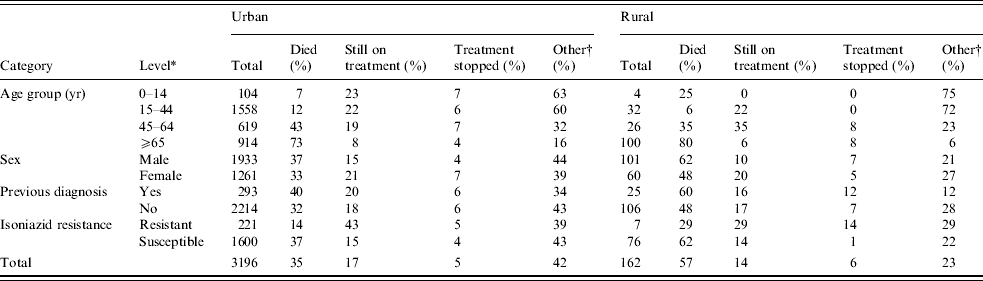 Table 1 shows the results of univariable and multivariable logistic regression analysis. The effect was non-significant (OR 1·02, 95% CI 0·83–1·26, P=0·82) in the multivariable analysis after controlling for age, sex, ethnicity, time since arrival in the United Kingdom, disease site, isoniazid resistance and previous diagnosis. Bivariable analysis showed that ethnic group and age were the greatest effect modifiers with the urban–rural odds ratio declining to 1·18 (95% CI 0·97–1·44, P=0·09) when adjusting for ethnic group, 1·29 (95% CI 1·06–1·57, P=0·01) when adjusting for age and 1·07 (95% CI 0·88–1·31, P=0·49) when adjusting for both. Table 2 shows a breakdown of outcome categories for cases that have not completed treatment by urban–rural location. A large proportion of these cases die within 1 year of diagnosis in both urban and rural areas. There is also a larger proportion of cases in urban areas whose final outcome is not really known (such as lost to follow-up or transferred out) compared to those in rural areas.