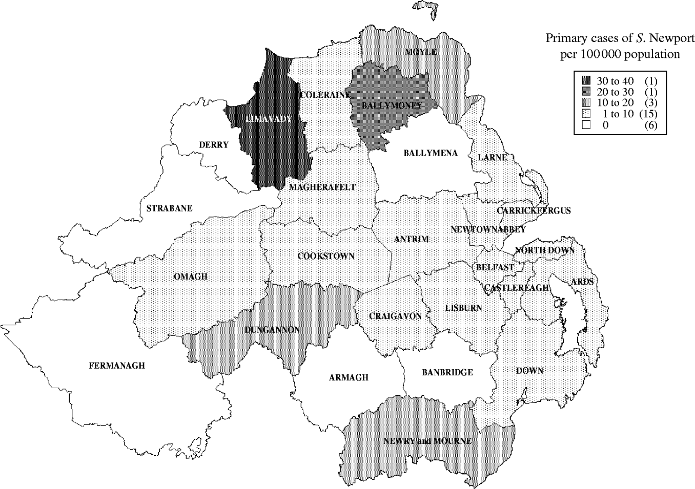 Fig. 2. Confirmed cases of Salmonella Newport, excluding travel-associated and secondary cases, with onset of illness 25 August to 14 October 2004 per 100 000 population, by Northern Ireland District Council of residence (n=95). (Based upon Ordnance Survey of Northern Ireland's data with the permission of the Controller of Her Majesty's Stationery Office, © Crown copyright and database rights NIMA ES&LA 210.4.)