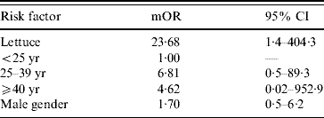 Univariate analysis showed a statistically significant association with the consumption of lettuce and the development of gastrointestinal illness (Table 1). Upon conditional logistic regression, only the consumption of lettuce was independently associated with being a case (OR 23·7, 95% CI 1·4–404·3) (Table 2).