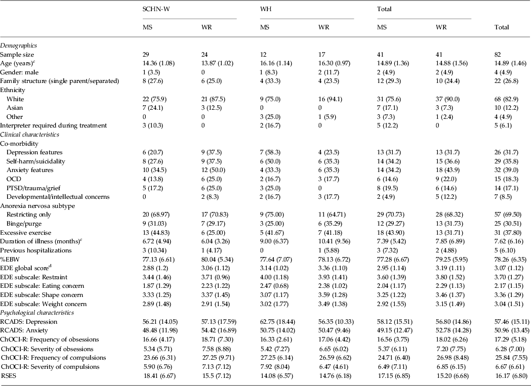 SCHN-W, Sydney Children's Hospitals Network, Westmead Campus; WH, Westmead Hospital; MS, medical stabilization; WR, weight restoration; OCD, obsessive–compulsive disorder; PTSD, post-traumatic stress disorder; %EBW, percentage expected body weight; EDE, Eating Disorder Examination; RCADS, Revised Child Anxiety Depression Scale; ChOCI-R, Children's Obsessive Compulsive Inventory Revised; RSES, Rosenberg Self-Esteem Scale.
