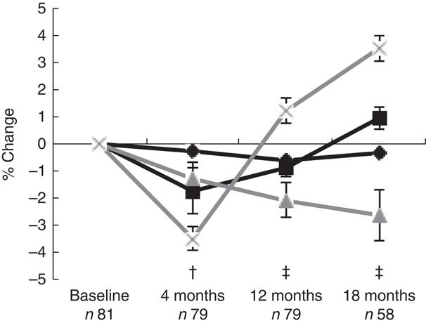Descriptive characteristics of the participating women are shown in Table 1. The number of women participating in the study was eighty-one at baseline and at 4 months postpartum, seventy-nine women at 12 months postpartum and fifty-eight women at 18 months postpartum. Reasons for leaving the study were new pregnancy (n 14), time constraints (n 6) and development of disease (n 3).
